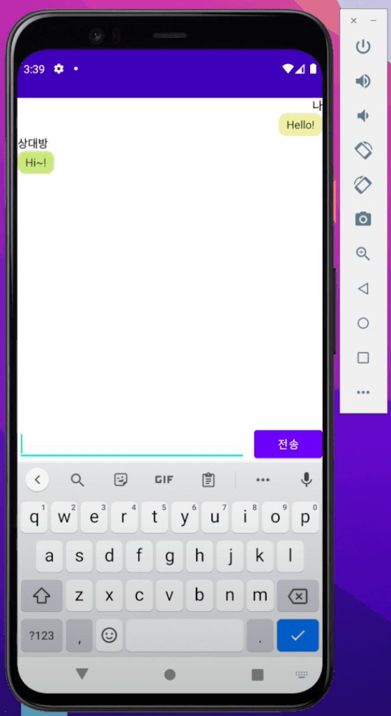 채팅방 화면은 서로 같은 채팅방 데이터베이스를 바라보는 사용자 2명이 접속하게 됩니다.