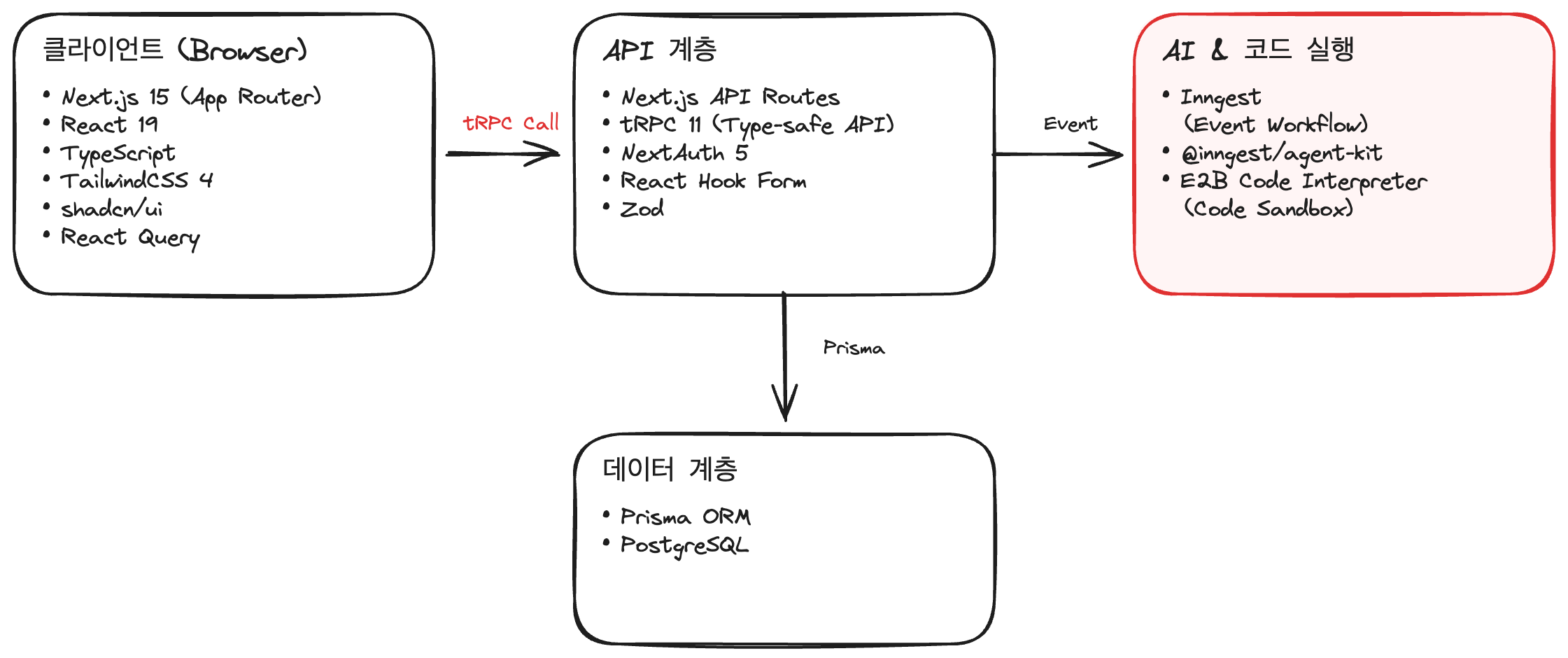 코드 생성 환경으로 E2B Code Interpreter를 선택했습니다. E2B는 클라우드 기반의 격리된 샌드박스를 제공하여, 서버에 Docker를 직접 운영하지 않고도 안전한 코드 실행 환경을 구성할 수 있습니다. 샌드박스마다 독립된 Next.js 환경이 프리셋으로 구성되어 있어, AI가 생성한 코드를 즉시 빌드하고 미리보기할 수 있습니다.