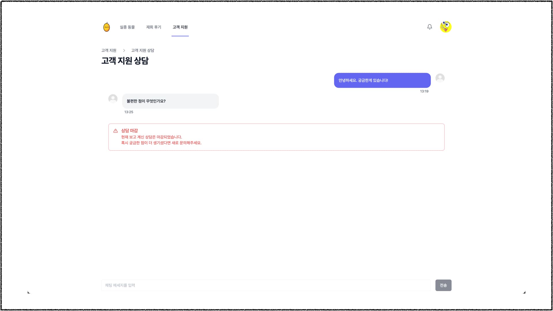 - 관리자는 상담을 종료할 수 있으며 종료된 상담방에서는 더 이상의 채팅이 불가능합니다.