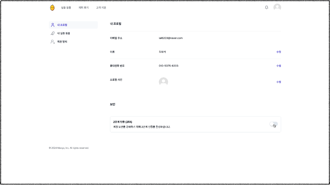 - 내 설정에서 2FA를 활성화한 사용자는 로그인 시 이메일로 발송된 인증 번호를 통해 로그인합니다.
